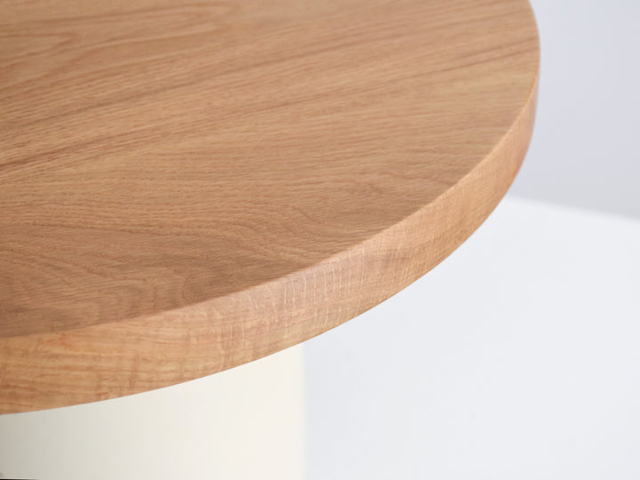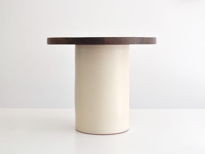 Mesa de centro artesanal em cerâmica meticulosamente feita à mão com base em grés e tampo em madeira de carvalho ou nogueira. Esta peça combina design simples e uma durabilidade incomparável.