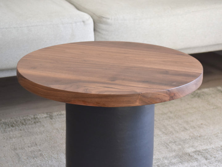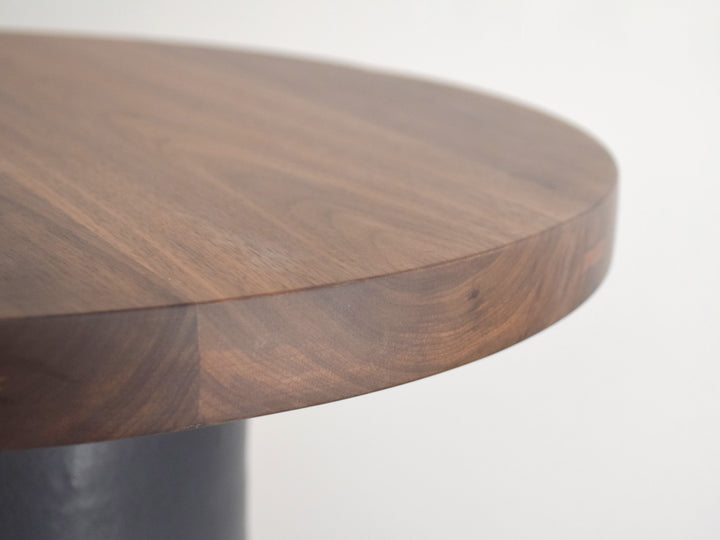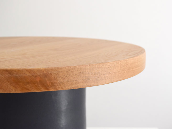 Mesa de centro artesanal em cerâmica meticulosamente feita à mão com base em grés e tampo em madeira de carvalho ou nogueira. Esta peça combina design simples e uma durabilidade incomparável.